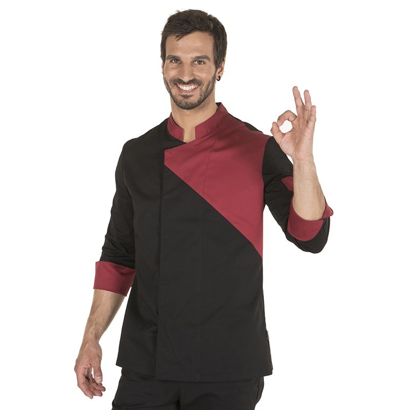 Chaqueta de cocina bicolor confeccionada en poliester-algodon, manga larga, cierre con clip metálico