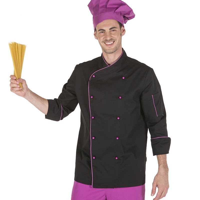 Chaqueta de cocina confeccionada en poliéster-algodón, con adorno bies de color y botón chupete.